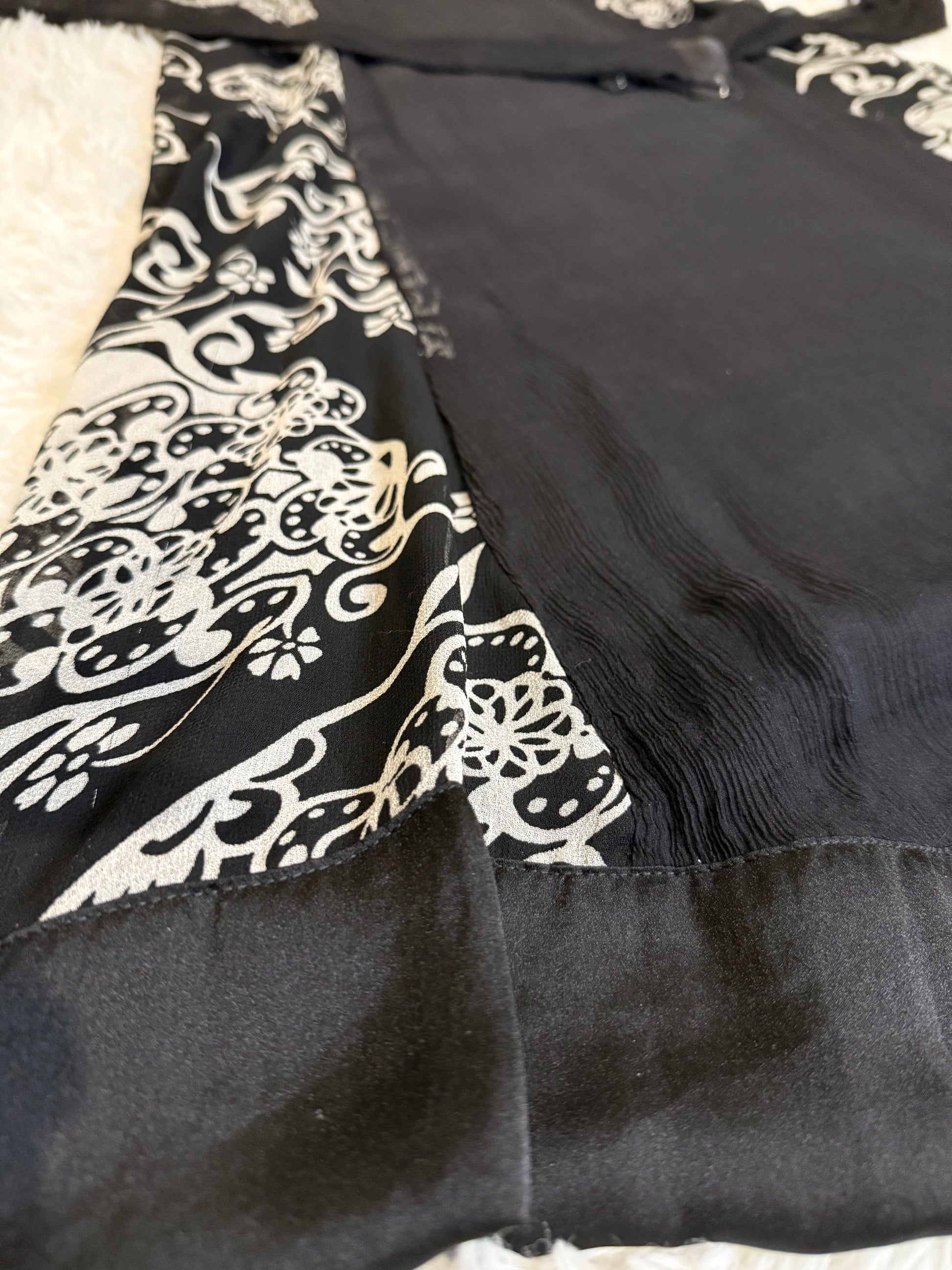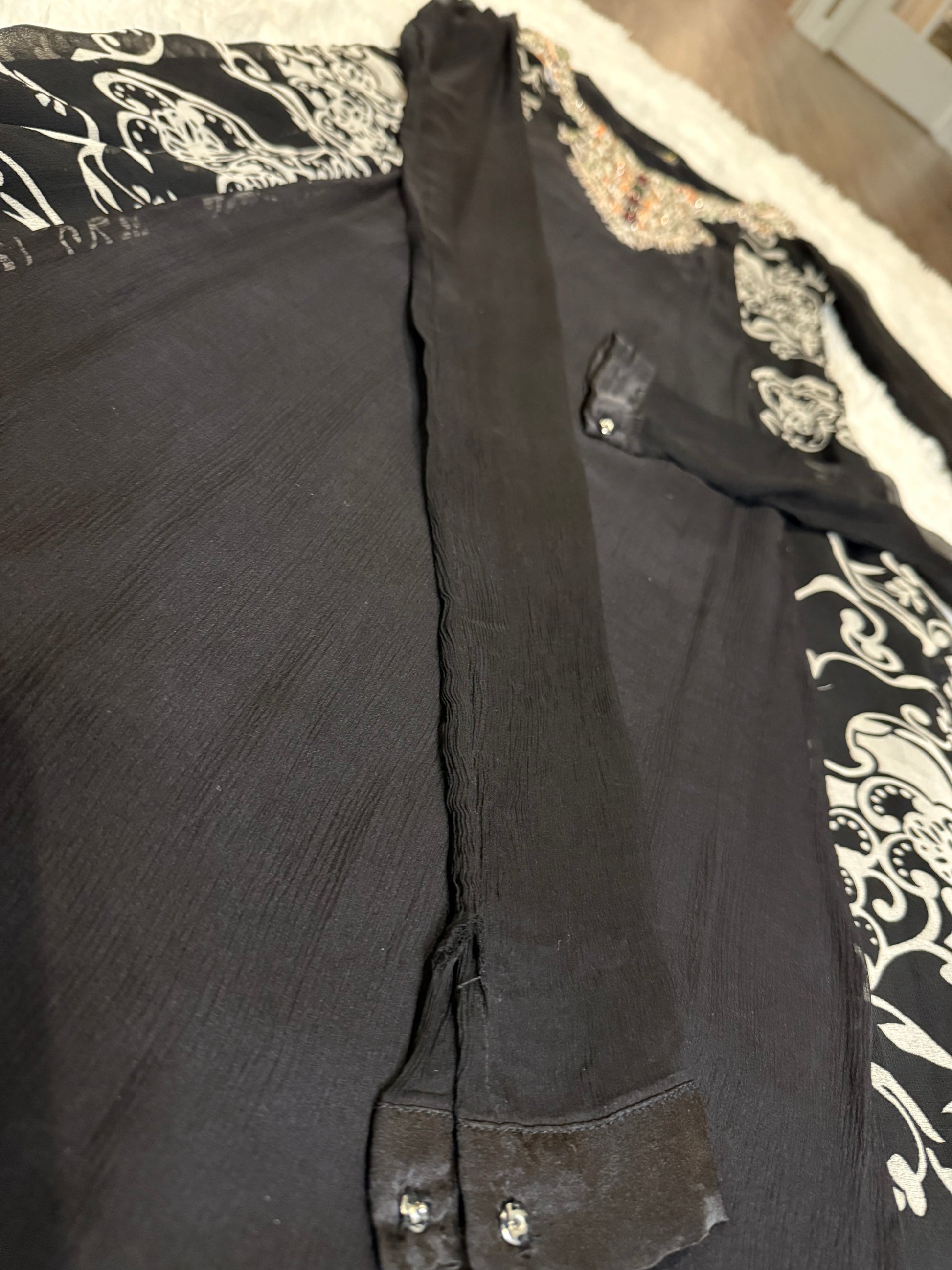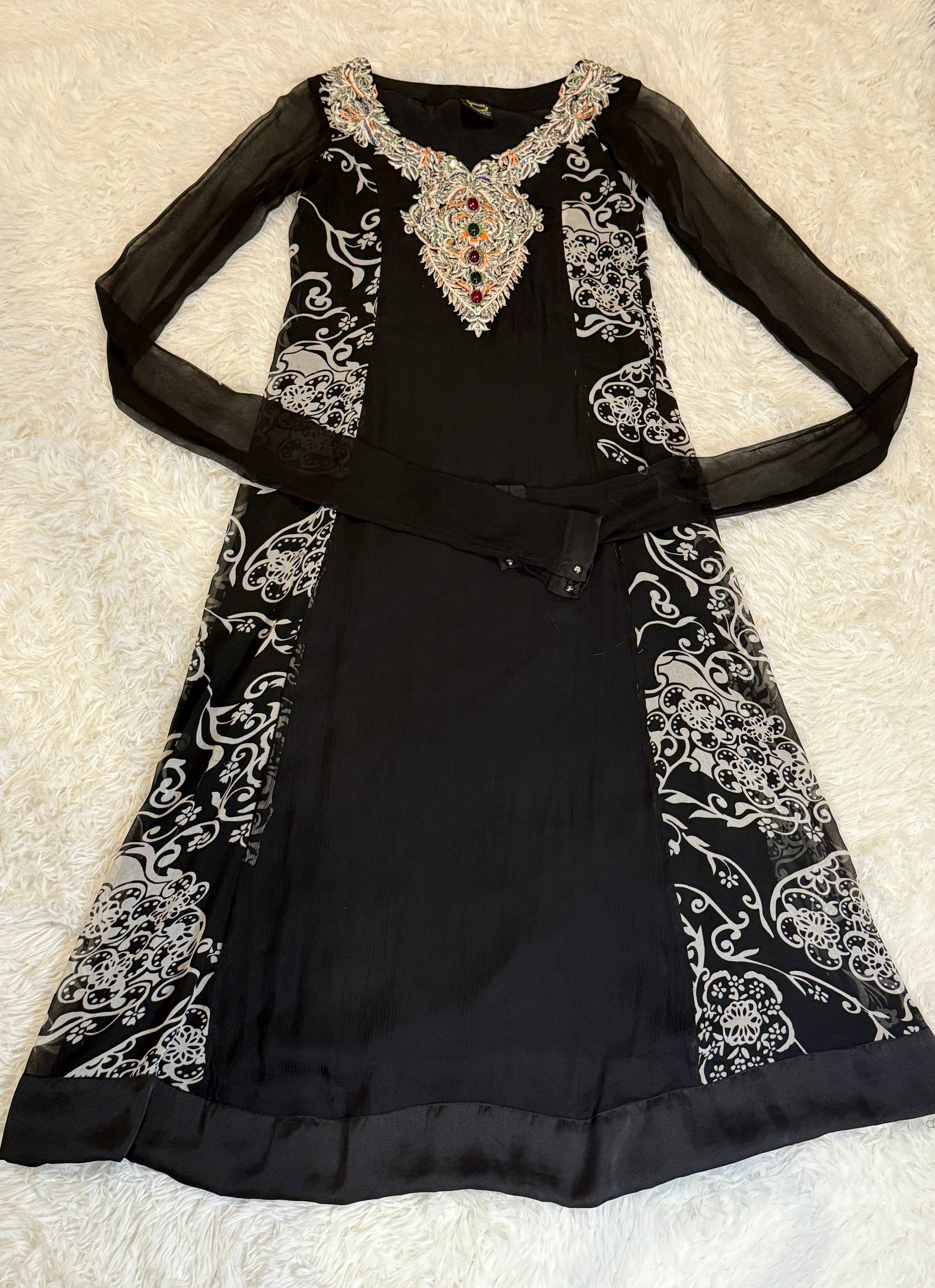 Zeenat by Hina Butt Black Chiffon Anarkali Style Suit with Pajama Pants and “Chinyere” Sleeves